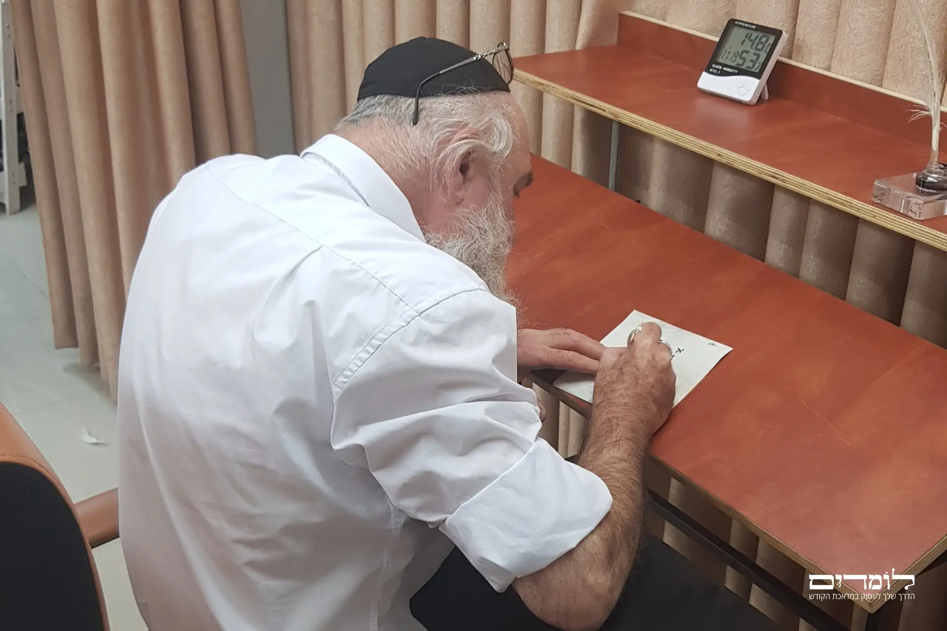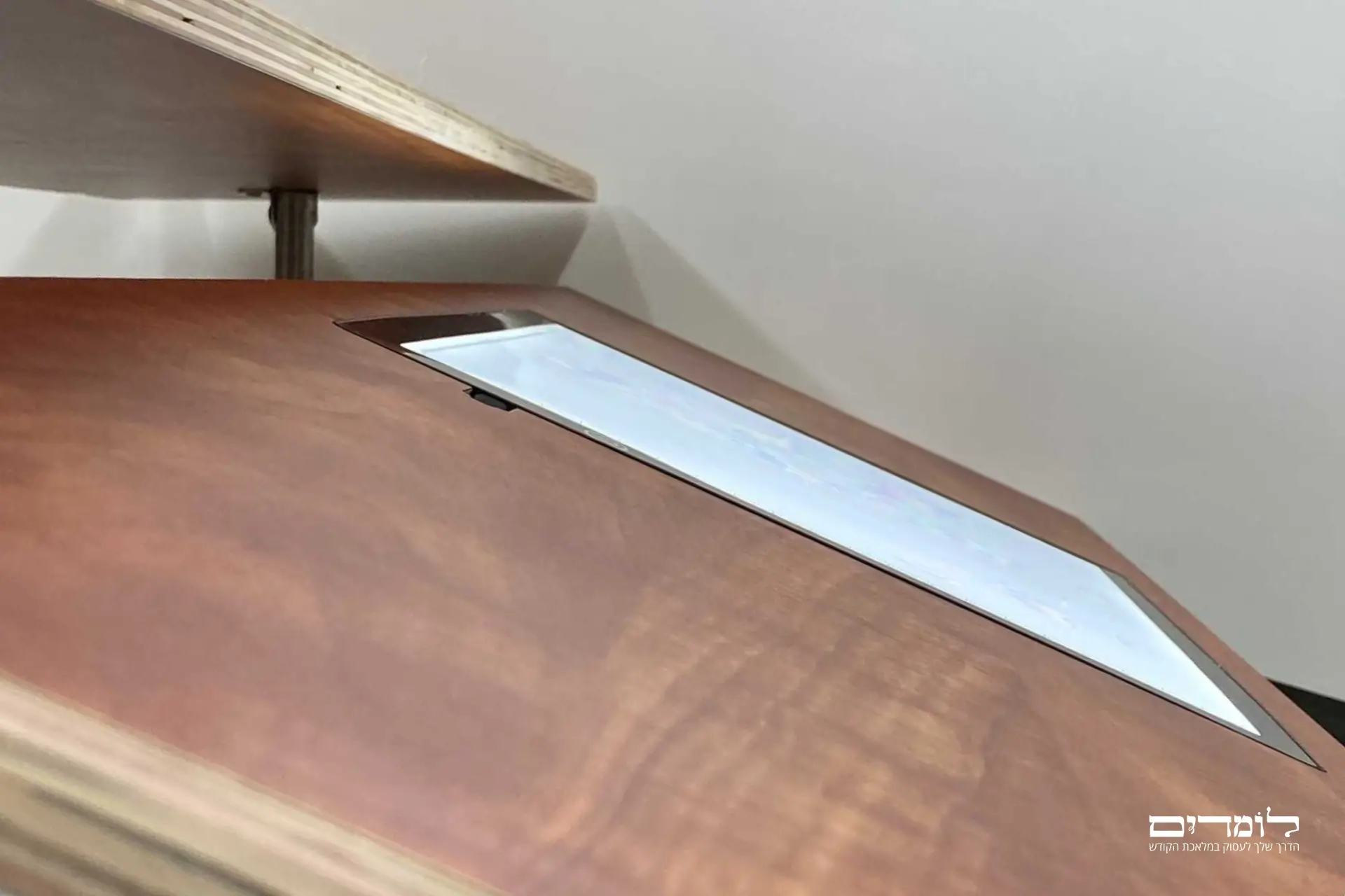 שולחנות עבודה לסופרי סת”ם: שולחנות יציבים עם אפשרות הטייה נוחה לכתיבה, התקנת תאורה מותאמת לכתיבה לאורך זמן. מתאים לכל סופר סתם.