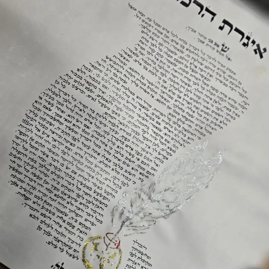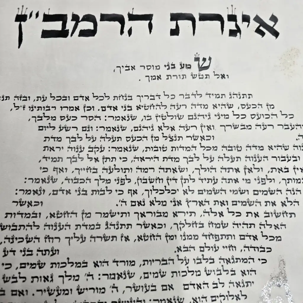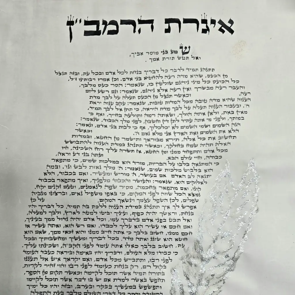 איגרת הרמב"ן, אחת מהאיגרות המוסריות החשובות ביותר בתולדות עם ישראל, נכתבת כאן בעבודת יד אומנותית על קלף מהודר, בגודל 50×50 ס"מ. הכתיבה מדויקת, נאה ומרגשת, ונעשית בידי סופר סת"ם מוסמך.