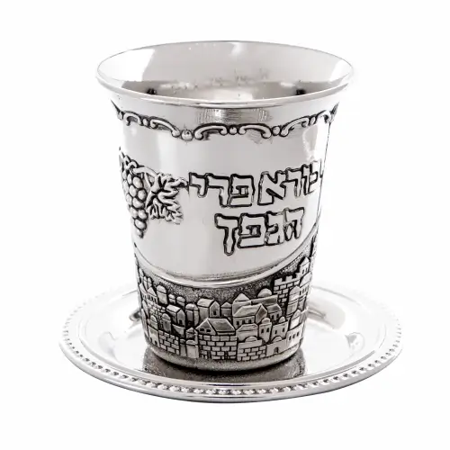 גביע קידוש מהודר בגימור ניקל מבריק, בעיצוב קלאסי ללא רגל, עם חריטת “בורא פרי הגפן” ודוגמת נוף ירושלים מרהיבה. הגביע מגיע עם תחתית תואמת ומארז יוקרתי, מה שהופך אותו למתנה מושלמת לחגים, לשבתות ולאירועים מיוחדים.